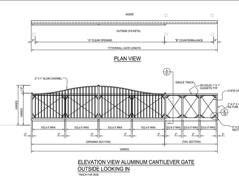 Ornamental cantilever gates are an excellent choice for providing a classy high profile entrance to any home or business. Ornamental gates use vertical pickets that are closely spaced to provide real security and appeal. Each gate is coated to provide a top-notch finish. Available in our standard manufactured styles or customized to your special design, a cantilever gate's overall length is usually one and a half the distance of the opening. So, if you have a 30’ opening; your gate is 45’ overall. You must account for this space along the fence where the gate stores. Aluminum ornamental cantilever gates use an aluminum square frame with an extruded track at the top. Trucks or trolleys are installed so that the trucks run inside the track to support the gate from the support posts. At the bottom, there are two guide wheels that keep the gate plumb and centered. Steel cantilever gates are very reliable and economic. Aluminum cantilever gates are definitely lighter, the rollers are enclosed and a great platform for an ornamental look. The enclosed track system is a much smoother operation during snow and ice storms. Our smooth overscalloped design provides a real point of entrance to any fene line. This design has an easy upward slope to teh center of the gate that provides a real look of class and elegance.   *Please note that the gate picture represents a custom gate.  Please refer to the style drawing for a more accurate representation of your gate.